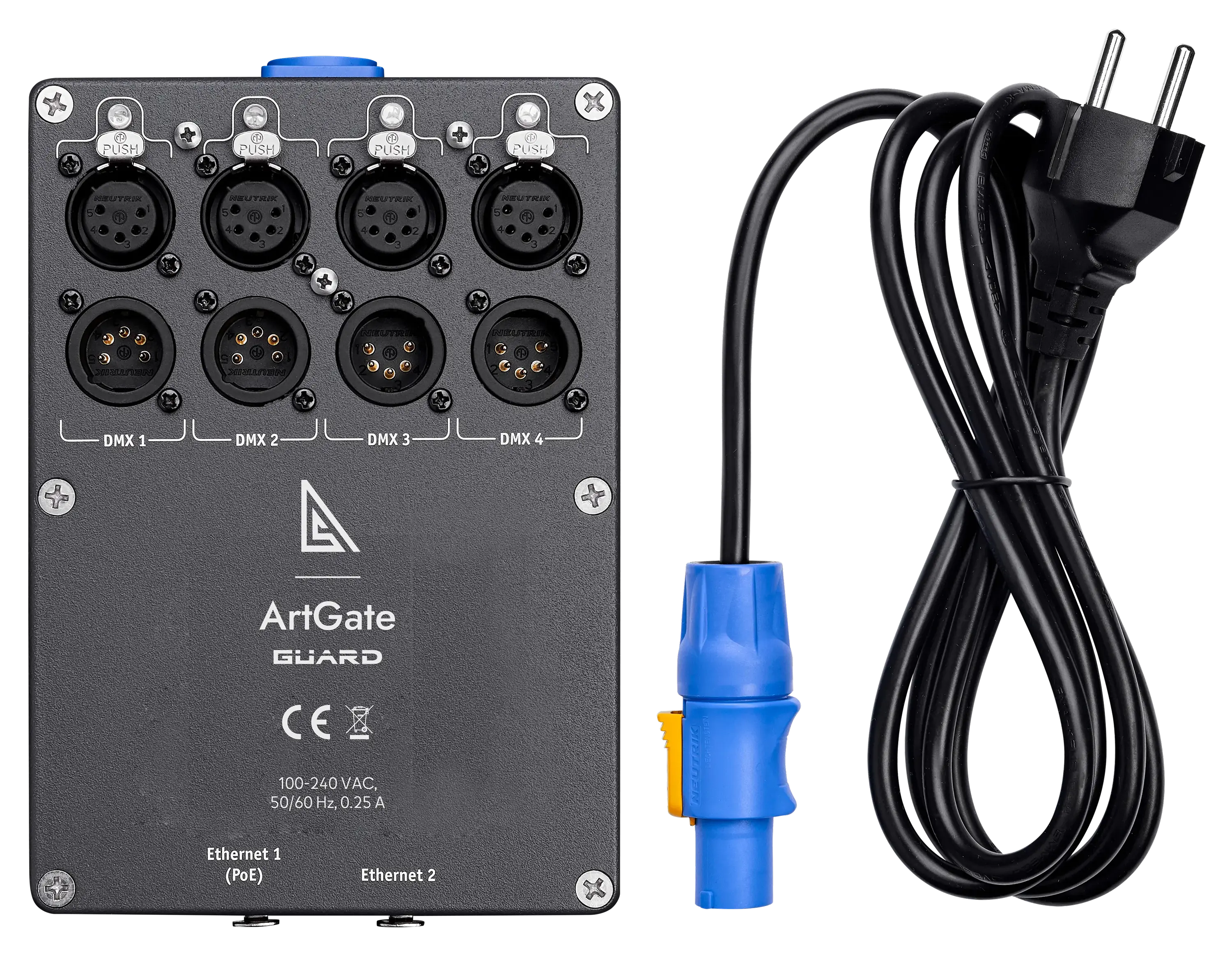 ArtGATE Guard operates as a bidirectional converter between Ethernet-based lighting networks (ArtNet, sACN) and DMX512 lighting control systems.