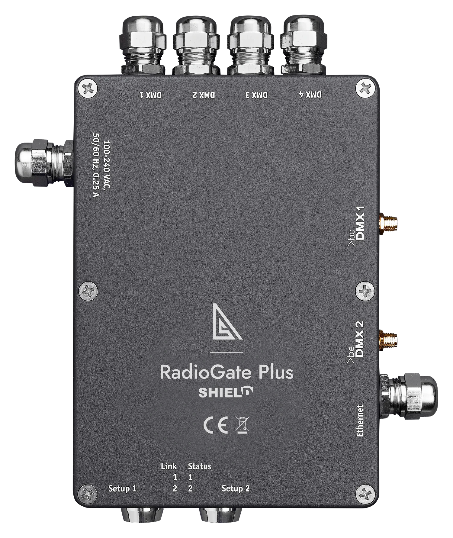RadioGATE Plus Shield is a powerful all-in-one device for professional lighting control that combines a wireless DMX transceiver, an ArtNet/sACN-to-DMX converter, and a DMX splitter with RDM support. Engineered for outdoor reliability, it offers seamless operation over both radio (beDMX) and Ethernet networks.