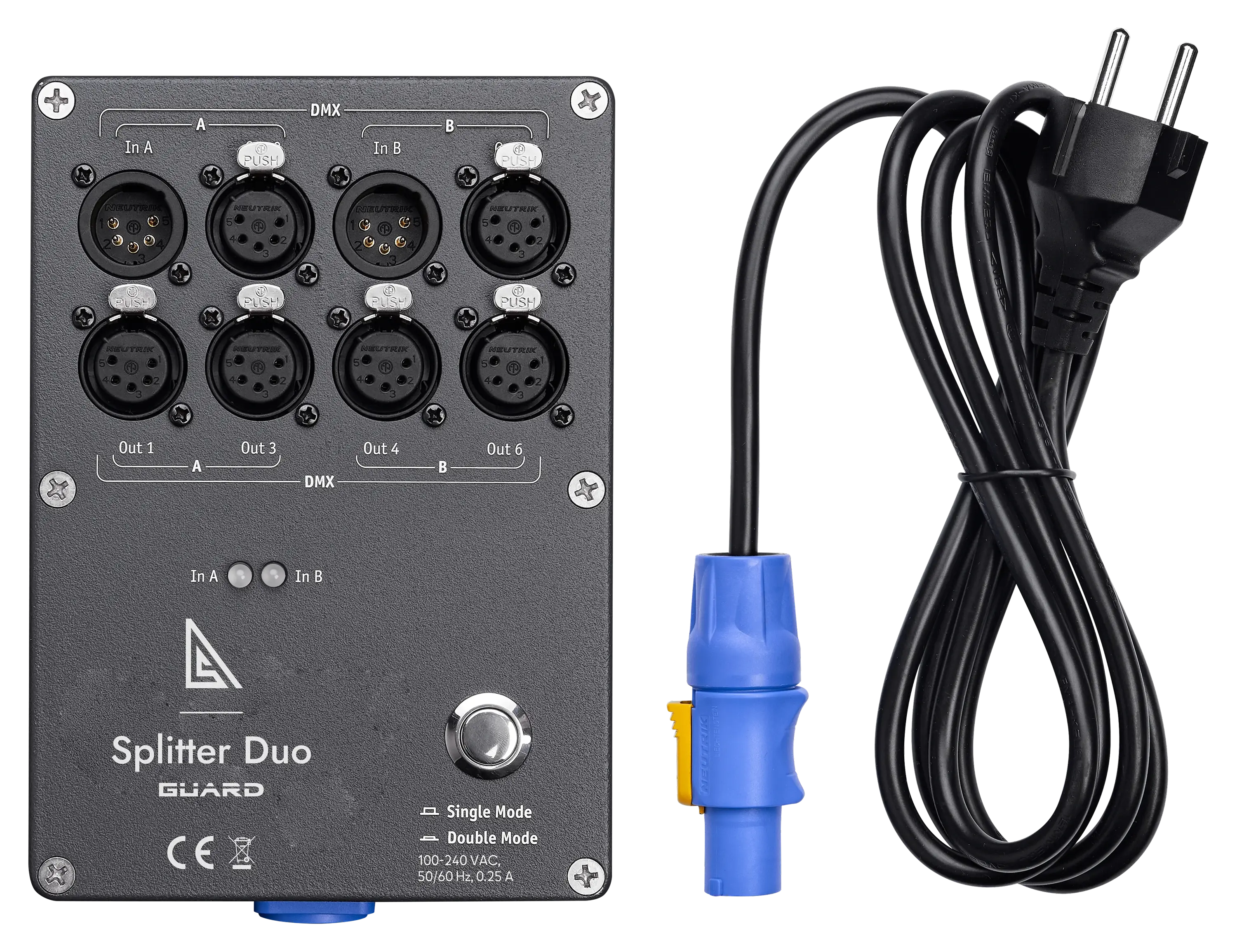 Splitter Duo Guard is a compact and reliable DMX splitter designed for indoor professional lighting systems. Featuring 2 DMX inputs and 4 galvanically isolated DMX outputs, the device can operate as a 1-to-5 splitter or as two independent 1-to-2 splitters, offering maximum versatility and built-in input redundancy.